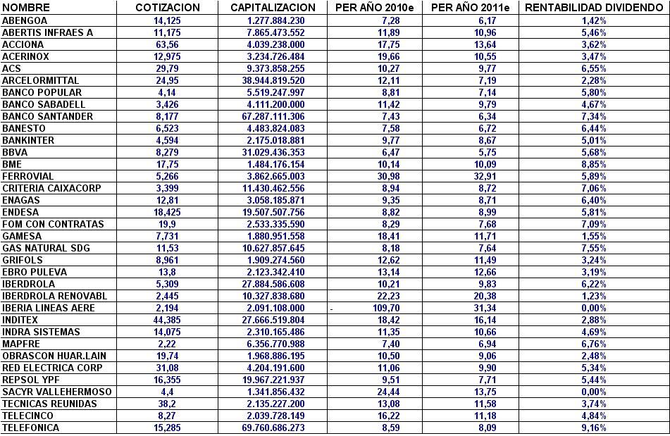 En este cuadro podemos ver el precio, capitalización, per 2010, per 2011 y la rentabilidad por dividendo de cada uno de los 35 valores del ibex. Podemos observar que tenemos 19 empresas con un dividendo superior al 5%, frente al 4% que nos da el bono a 10 años.