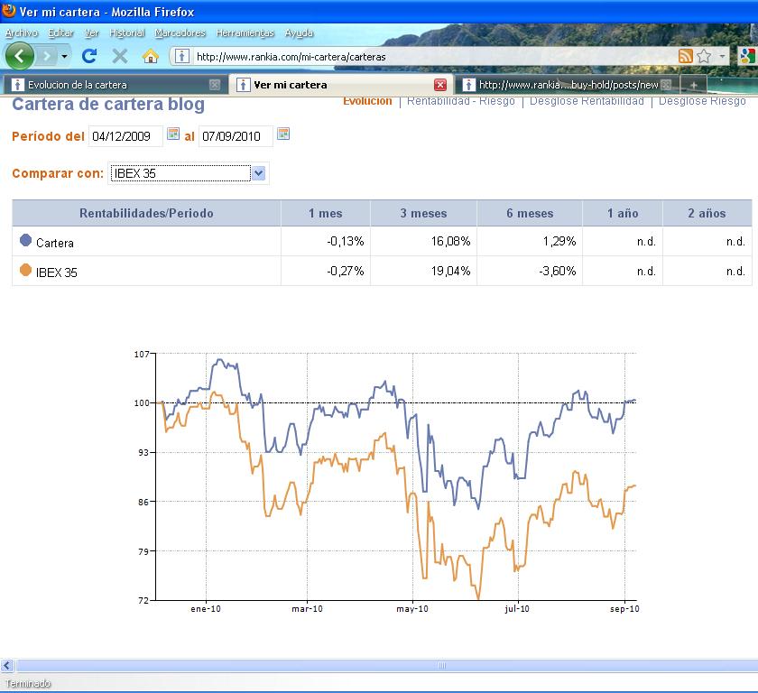Por ultimo vamos a dar un vistazo a la evolución de la cartera frente al ibex para poder comparar aunque sea gráficamente su volatilidad.