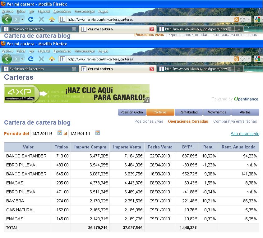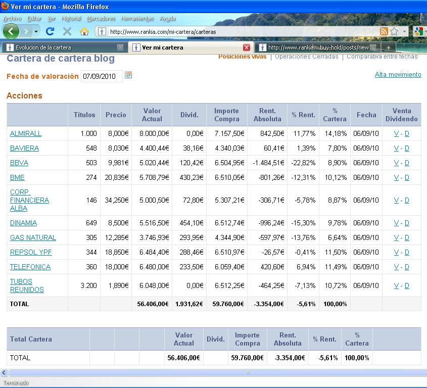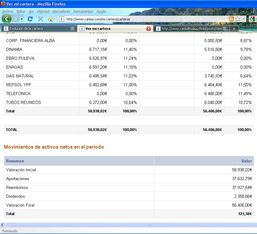 Para estudiar la rentabilidad, a la perdida de la cartera actual de 3.354€ debemos añadir el beneficio o perdida generado en las operaciones cerradas y los dividendos cobrados, para lo cual contamos con las dos siguientes páginas: