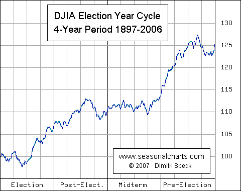 El año de las elecciones: Es el segundo mejor año de los 4 y principalmente conforme se va acercando el día de las elecciones y en los dos meses posteriores. La lógica de este buen comportamiento es por que los gobernantes intentan mejorara la percepción de los ciudadanos, tanto con publicidad como con promesas.