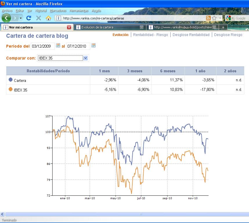 Por ultimo vamos a dar un vistazo a la evolución de la cartera frente al ibex para poder comparar aunque sea gráficamente su volatilidad.
