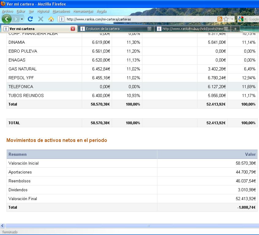 Para estudiar la rentabilidad, a la perdida de la cartera actual de 7.256,58€ debemos añadir el beneficio o perdida generado en las operaciones cerradas y los dividendos cobrados, para lo cual contamos con la siguiente página: