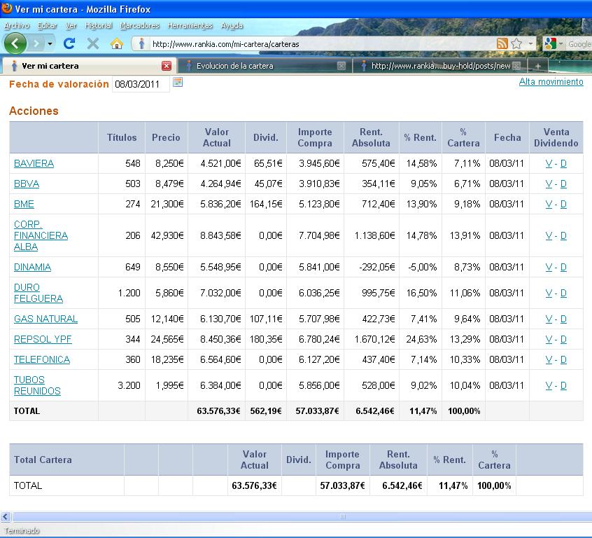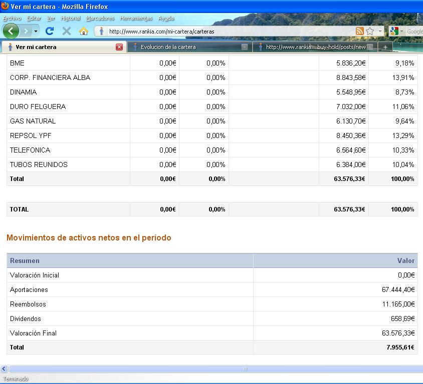 Podemos observar que una vez añadido los dividendos (658,69€) y las operaciones cerradas (casi 800€) el resultado en este año es de un beneficio de 7955,61€, lo que supone una rentabilidad del 13,26%. El ibex en este periodo ha pasado del 9.890 al 10.569 lo que supone una rentabilidad del 6,87%, por lo que la diferencia de evolución es del 6,39%. Vamos a compararnos también con el ibex + dividendos. El ibex pagaba un 5,5% en dividendos a fecha de inicio de la cartera y como llevamos 3 meses vamos a restarlo a nuestra evolución. Por lo tanto, la evolución contra el ibex, incluidos dividendos, seria del 5,01% (el 6,39% - el 1,38%).