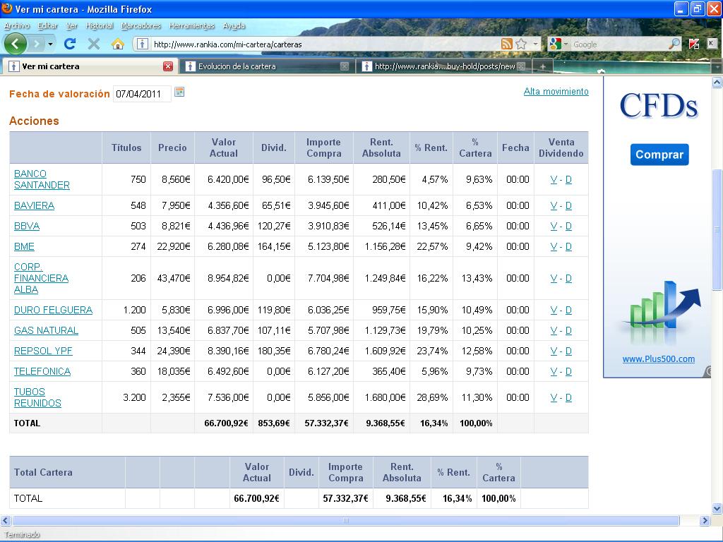 Para estudiar la rentabilidad, al beneficio de la cartera actual de 9.368,55€ debemos añadir el beneficio o perdida generado en las operaciones cerradas y los dividendos cobrados, para lo cual contamos con la siguiente página: