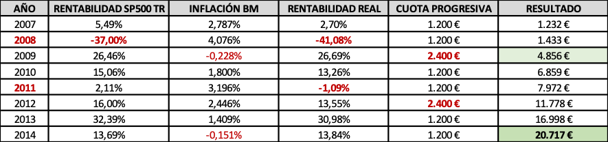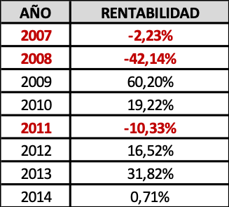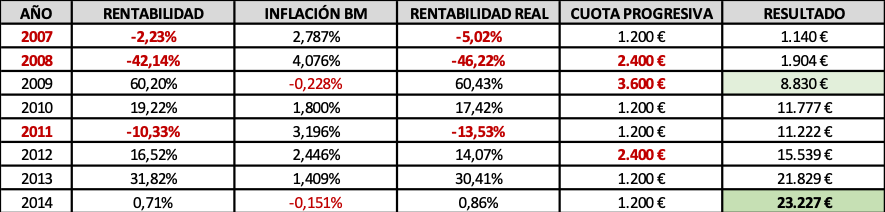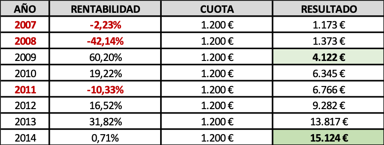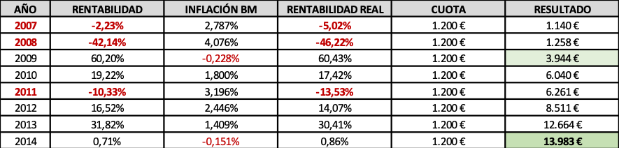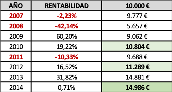 Veámoslo con un ejemplo usando las rentabilidades nominales, libres ya de comisiones y gastos, que FG Paramés obtuvo al mando de Bestinfond durante los 8 convulsos años que median entre 2007-2014: