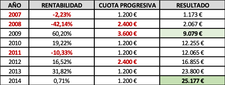 Pero insisten también los gestores en aportar más dinero cuando la bolsa cae pues a menor precio de las acciones mayor rentabilidad futura y menor riesgo. Supongamos entonces que nuestro inversor aporta el doble de lo habitual en 2008, tras las caídas de 2007. Es decir, en vez de 1.200€ invertirá 2.400. Y en 2009, tras otro año de caídas, persistirá contumazmente invirtiendo el triple de lo habitual, 3.600€. A su vez, en 2011, tras las depreciaciones de 2010, invertirá el doble de lo normal, 2.400€. ¿Tendrán razón los gestores? Veámoslo: