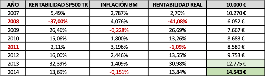 Si nos ceñimos al ejemplo de la cantidad inicial invertida gana el SP500 TR, que obtiene una rentabilidad total acumulada del 45.43%, un 4.79% compuesto anual frente al 2.81% de FGP, aunque aquí tampoco es posible recuperar lo invertido sin pérdida hasta terminado el año 2013: