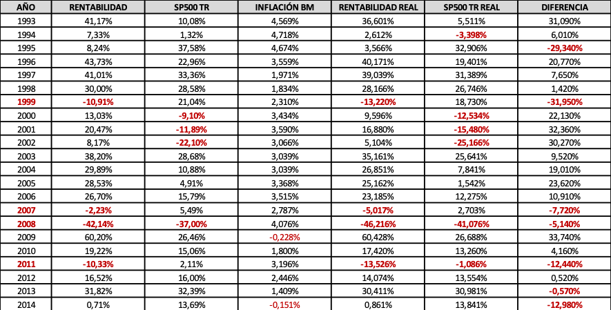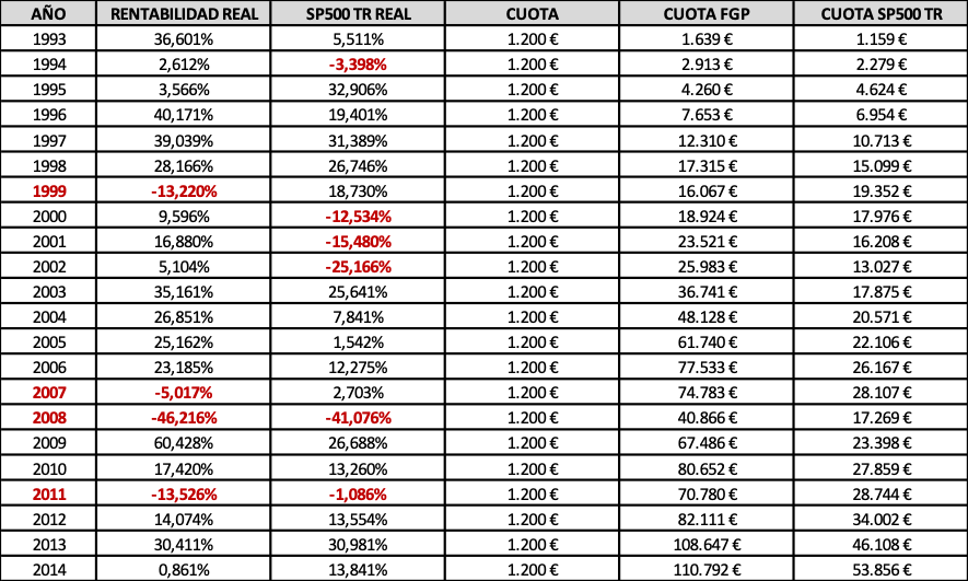 Veámoslo con perspectiva histórica a la luz de las rentabilidades anuales en términos reales obtenidas por FGP y el SP500 TR durante los 22 años que median entre 1993 y 2014: