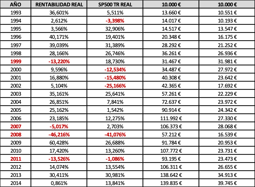 Como podemos observar la balanza se inclina con mucha diferencia del lado de la gestión activa realizada por F.G. Paramés a pesar de existir 7 ejercicios donde el SP500 TR lo ha hecho mejor, la mayoría concentrados en el período 2007-2014. Aún así, 10.000€ con FGP se convertirían en 139.835€ reales, ofreciendo una rentabilidad total acumulada del 1298%, un 12.74% compuesto anual frente al 297% y 6.47% respectivamente del SP500 TR, que obtiene 39.745€ reales, y del que todavía habría que restar retenciones tributarias a los dividendos y comisiones: