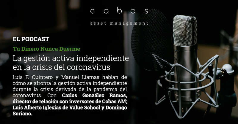 tenemos el gusto de compartir con ustedes el capítulo del programa de inversión y finanzas "Tu Dinero Nunca Duerme", en el que Luis F. Quintero y Manuel Llamas hablan, de cómo afrontan la crisis del COVID-19 las gestoras activas independientes, con Carlos González Ramos, Director de Relación con Inversores Particulares de Cobas AM, Luis A. Iglesias, de Value School, y Domingo Soriano.