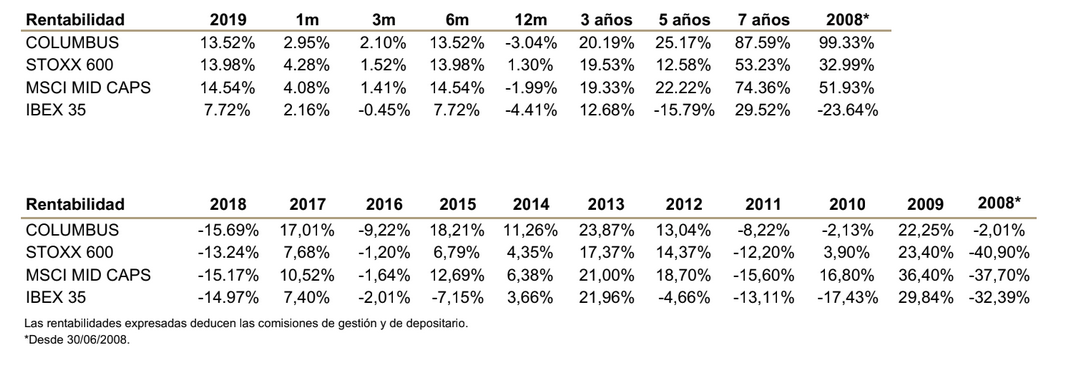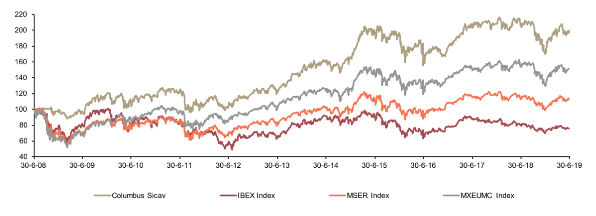 Desde principios de año, la rentabilidad es del 13.52%. A tres y siete años, la rentabilidad es del 20.19% y 87.59% respectivamente y, desde el inicio de la gestión de Columbus en julio del 2008, del 99.33%, superando ampliamente la de los índices europeos de renta variable. La volatilidad de la cartera se mantiene en el 11.7%, muy inferior a la media de los últimos años y similar a la volatilidad del STOXX 600. Durante junio, las Bolsas mundiales han revertido parcialmente las fuertes bajadas del mes anterior. El temor a las consecuencias de la guerra comercial ha dejado paso al estudio de las medidas que los bancos centrales. Refugio ante esta situación han sido los bonos gubernamentales, que en muchos casos han marcado mínimos históricos en sus rentabilidades. Los futuros descuentan en estos momentos que la Reserva Federal bajará tipos hasta 3 veces en los próximos meses con una primera bajada el próximo mes de septiembre. El BCE también ha anunciado medidas de apoyo al sector bancario. Seguimos creyendo que, si bien hay una ralentización económica, en ningún caso esperamos una recesión.