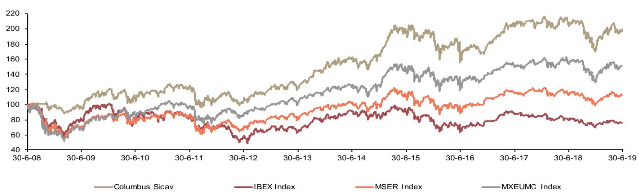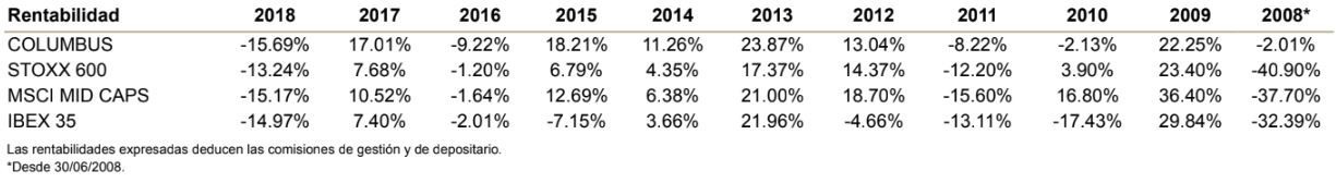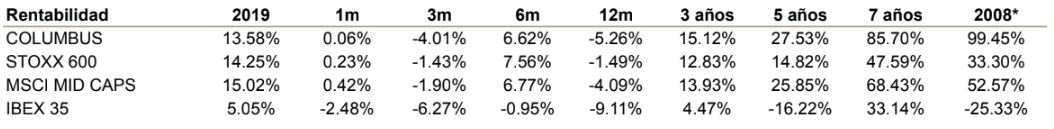 Desde principios de año, la rentabilidad es del 13.58%. A tres y siete años, la rentabilidad es del 15.12% y 85.70% respectivamente y, desde el inicio de la gestión de Columbus en julio del 2008, del 99.45%, superando ampliamente la de los índices europeos de renta variable. La volatilidad de la cartera se mantiene en el 11.7% muy inferior a la media de los últimos años y similar a la volatilidad del STOXX 600.