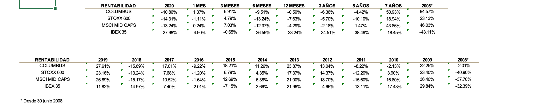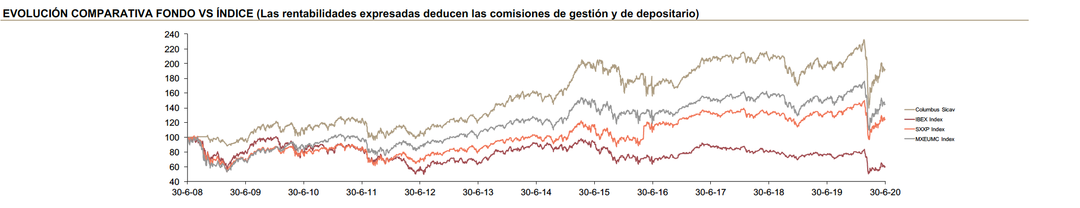 Durante julio, la rentabilidad de Columbus ha seguido recuperándose con una subida del +1.37% frente al +0.24% del MSCI Mid Cap y las bajadas del STOXX 600 (-1.11%) y del IBEX (-4.90%). En los últimos tres meses, Columbus sube un +6.91% y desde el punto más bajo, el 18 de marzo, un 41%. Esta subida permite disminuir las pérdidas de los últimos 12 meses de Columbus a tan solo el -0.59%. Desde el principio del año, acumula una rentabilidad del -10.86%. Una bajada importante pero inferior a las de los índices europeos, que oscilan desde el -13.24% del MSCI Mid Cap al -27.98% del Ibex. Desde el inicio de la gestión de Columbus en julio del 2008, la rentabilidad ha sido del 94.57%, superando ampliamente los índices europeos de renta variable. La volatilidad de la cartera en los últimos doce meses se sitúa en el 22.5% frente al 26.9% del STOXX600 NR.