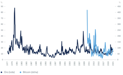 Volatilidad histórica (anualizada) en períodos de 60 días del oro (e. izq.) y el Bitcoin (e. dcha.) Fuente: Bloomberg Finance L:P:, Deutsche Bank AG. Datos de abril 2021.