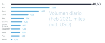 Los volúmenes de transacciones diarios del Bitcoin están aún muy por debajo de los del oro y de muchas materias primas. Fuente: Bloomberg Finance L.P., Deutsche Bank AG. Datos de febrero de 2021.