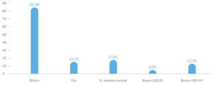 El Bitcoin es más volátil que el resto de activos tradicionales (según rentabilidades en periodos consecutivos semanales).
