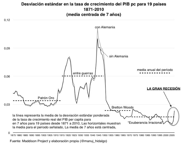 Podemos ver un ejemplo bastante claro en el caso de los ciclos económicos de Estados Unidos, pero es un fenómeno que se ha extendido a escala global tal y como muestran los datos recopilados por Maddison Project, (ver imagen).