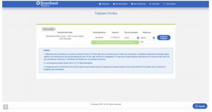 En 3 clics deberás indicar si el traspaso es total o parcial (en caso de parcial elegir el importe o las participaciones a traspasar) y confirmar la operación, nosotros nos encargaremos del resto.