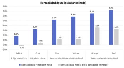 3 clics para traspasar tus fondos, para pagar comisiones mucho menores y para que obtengas mayor rentabilidad por tus ahorros. Lo puedes comprobar en el gráfico adjunto, según datos de Inverco, en el que se ve la rentabilidad obtenida por las carteras de Finanbest desde nuestra salida al mercado comparada con la media del resto de entidades. Muy probablemente, estás perdiendo dinero por no tener tus fondos en Finanbest.