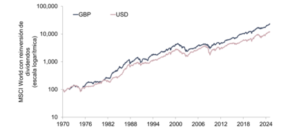 Una preocupación habitual en la inversión internacional es el riesgo cambiario. El mercado mundial de divisas funciona las 24 horas del día, los siete días de la semana. Los tipos de cambio están en constante movimiento y estas fluctuaciones pueden afectar a la rentabilidad a corto plazo. Para el inversor que reside en Estados Unidos, un dólar más débil puede aumentar la rentabilidad de las acciones no estadounidenses, mientras que un dólar más fuerte puede actuar como un factor adverso. Aunque estos movimientos pueden parecer considerables a corto plazo, su impacto en la rentabilidad a largo plazo de una cartera suele ser escaso en los mercados desarrollados. A lo largo de períodos prolongados, las fluctuaciones de las divisas tienden a compensarse. Por ejemplo, el análisis del índice MSCI World en dólares estadounidenses y libras esterlinas desde 1970 muestra que, si bien existen períodos en los que una divisa es más fuerte, las diferencias de rentabilidad a largo plazo suelen ser reducidas. En la figura 2, Fisher Investments España analiza el índice MSCI World en libras esterlinas y en dólares estadounidenses desde 1970 para respaldar su opinión de que las fluctuaciones de las divisas tienden a equilibrarse con el paso del tiempo. Figura 2. A largo plazo, las fluctuaciones monetarias se compensanFuente: FactSet, a 12/11/2025. MSCI World con reinversión de dividendos, del 31/12/1969 al 31/10/2025.