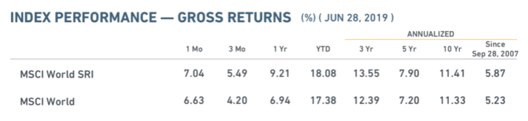 Si comparamos la rentabilidad de la renta variable mundial indexada socialmente responsable con el índice general obtenemos esta tabla de MSCI: