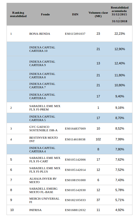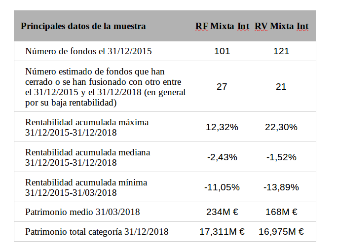 En el último año se han dado de baja en la categoría de Renta Fija Mixta Internacional 4 fondos y en la de Renta Variable Mixta Internacional 6 fondos, algunos por baja rentabilidad y otros por absorción de la gestora por otra gestora.