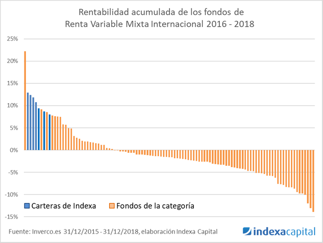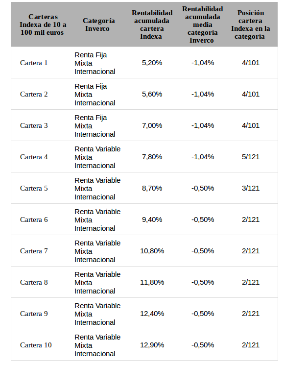 Se puede observar que las carteras de Indexa han tenido mejores resultados que el 97% de los fondos de su categoría, llegando a obtener el segundo mejor resultado en la categoría de renta variable mixta internacional. Es decir, sólo 1 fondo de 121 ha obtenido una rentabilidad superior.