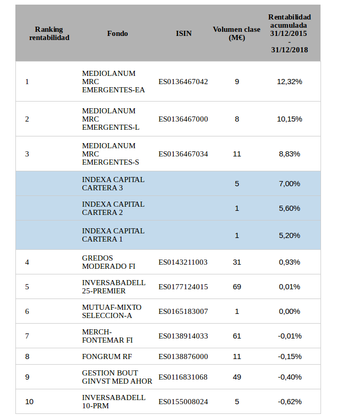 Los tres primeros fondos de la categoría renta fija mixta internacional son fondos que invierten en bonos emitidos por países emergentes y en nuestra opinión no deberían estar en esta categoría de renta fija mixta internacional. Deberían estar en la categoría de renta fija internacional, no renta fija mixta, porque no incluyen acciones y un fondo mixto es un fondo que incluye bonos y acciones. En este caso, nuestras carteras estarían incluso mejor posicionadas, en el 1er puesto sobre más de 100 fondos.