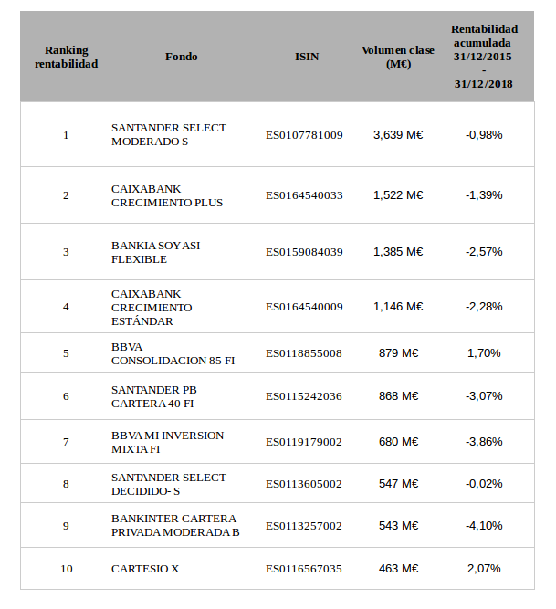 El mayor fondo por patrimonio (Santander Select Moderado) de 3.639M€, ha obtenido una rentabilidad acumulada negativa de -0,98% mientras que nuestras carteras de la misma categoría (las carteras 4 a 10), que han obtenido rentabilidad entre +7,8% y +12,9%. El segundo mayor, Caixabank Crecimiento, ha obtenido una rentabilidad de -1,39%, el tercero de Bankia (Bankia Soy Así Flexible) de -2,57% y el peor de los diez es de Bankinter (Bankinter Cartera Privada Moderada) que ha caído un -4,10%. De los 10 mayores fondos, solo 2 consiguen, por poco, rentabilidades positivas en 3 años, mientras que el resto han hecho perder dinero a sus clientes a pesar de los mercados han sido alcistas en este período. Es una buena muestra del efecto negativo que tienen las elevadas comisiones y la baja diversificación (en los últimos 3 años, las acciones europeas han rentado mucho menos que las de EEUU y los fondos españoles invierten mayoritariamente en empresas europeas).