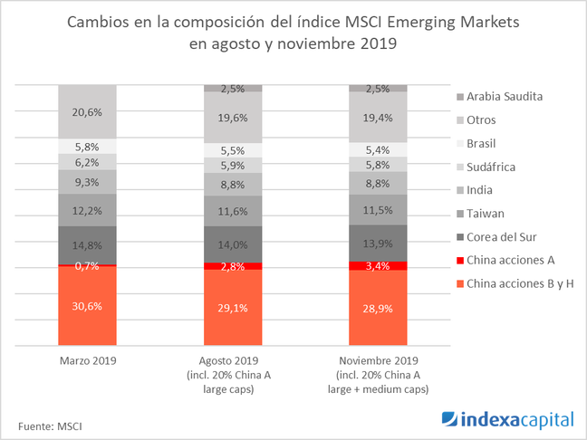 En el siguiente gráfico aparece la distribución del índice MSCI Emerging Markets a día de hoy, en agosto 2019 y en noviembre 2019:
