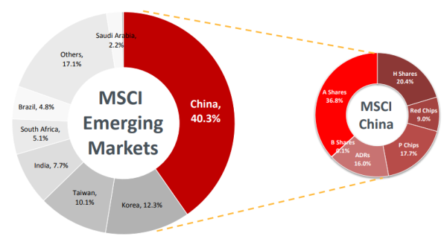El índice MSCI Emerging Markets se construye invirtiendo en acciones líquidas de las bolsas de países emergentes de manera proporcional a su capitalización de mercado. Invierte en 24 países y con 1.125 empresas, el índice cubre aproximadamente el 85% de la capitalización de mercado ajustada por free-float (la parte de las acciones que están disponibles en bolsa) en cada país. Uno de esos países es China.