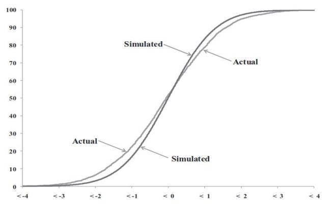Esto es lo que indica la gráfica a continuación. La lectura del gráfico es relativamente compleja y lo explicamos al final del artículo. Lo que importa es que si la curva de fondos reales (“Actual”) está a la izquierda de la curva de fondos simulados (“Simulated”) entonces los fondos reales tienen un comportamiento peor que el que se esperaría por suerte.