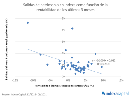 Hemos vuelto a actualizar estos datos en octubre de 2021 y el resultado es magnífico: el R2 ha descendido a tan sólo 6%, lo que implica que nuestros clientes aportan y retiran dinero independientemente de la evolución del mercado.