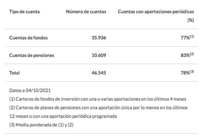 Este mismo análisis lo realizamos en agosto de 2019 y desde entonces el porcentaje de clientes que realizan aportaciones periódicas ha aumentado ligeramente de 74% a 78%. Por tanto, no solo el dato es bueno, sino que, además, está mejorando.
