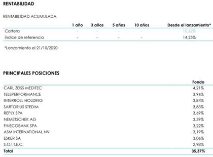 Después de un gran final de año, 2021 ha comenzado nuevamente de manera positiva para nuestra selección de valores, impulsada por las primeras publicaciones de resultados anuales de excelente calidad para muchas compañías en el campo de la tecnología médica y la innovación digital, pero también en el campo de la automatización industrial y la logística (mostrando continuidad en sus excelentes operaciones en un entorno de demanda positiva).