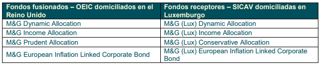 Los activos de los fondos mencionados se fusionarán con los fondos M&G (Lux) Dynamic Allocation, M&G (Lux) Income Allocation, M&G (Lux) Conservative Allocation y M&G (Lux) European Inflation Linked Corporate Bond, respectivamente.