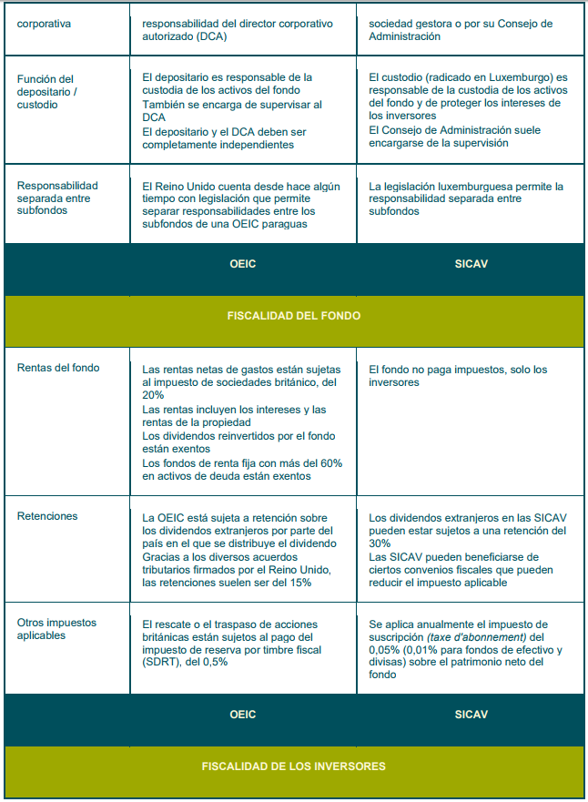 En la práctica, las OEIC y las SICAV tienen una estructura muy parecida y ambas ofrecen la posibilidad de establecer sociedades paraguas que engloben diversos subfondos y que se ajusten a la normativa sobre OICVM.