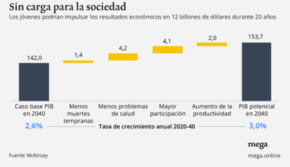 Si los gobiernos y las empresas logran encontrar formas de satisfacer las demandas de este grupo, esto podría impulsar el rendimiento económico mundial en 12 000 billones de dólares estadounidenses, equivalente a un 8%, en 2040, comenta McKinsey.