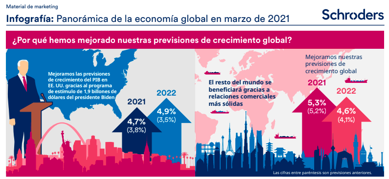 Hemos mejorado nuestras previsiones de crecimiento mundial para los próximos dos años, y creemos que el principal cambio se producirá en 2022, cuando las economías se hayan normalizado más y la política fiscal y monetaria siga siendo flexible. Para este año, sin embargo, las mejoras en los Estados Unidos, el Reino Unido, Japón y algunas economías emergentes se ven compensadas en gran medida por una fuerte rebaja en la zona euro, lo que hace que nuestras previsiones de crecimiento mundial no varíen.
