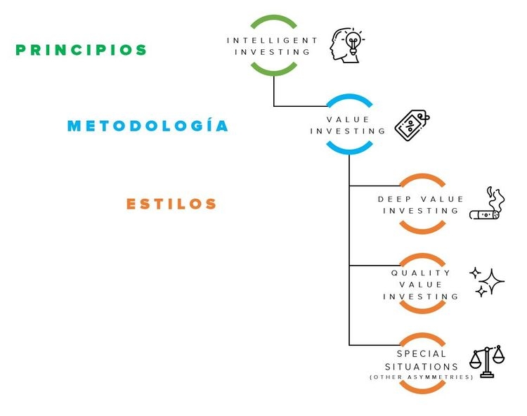 Considerando esto, podemos concluir que el value investing es la materialización metodológica en el ámbito de la inversión del intelligent investing. Es decir que, en cualquier caso, el primer concepto debería estar englobado en este segundo, más abstracto y amplio. Tengo mis reservas a la hora de determinar si hay cabida para más metodologías que puedan acompañar al value investing en ese segundo escalón, puesto que es difícil aunar las ideas y premisas del intelligent investing de manera más pura. Pero, eso sí, debajo del value investing encontramos distintos estilos. Si el value investing gira alrededor del concepto del margen de seguridad, la variedad de estilos que funcionan es muestra de que existen distintos enfoques para calcularlo, dependiendo de las características de cada empresa. Pese a ello, no debemos olvidar que estos estilos NO son excluyentes entre sí y que todos permiten encontrar ineficiencias que justifiquen una decisión de inversión como inteligente. Sí, lo sé... Es un lío. El siguiente esquema debe servir para que podamos ubicar cada uno de estos conceptos en el nivel que les corresponde: