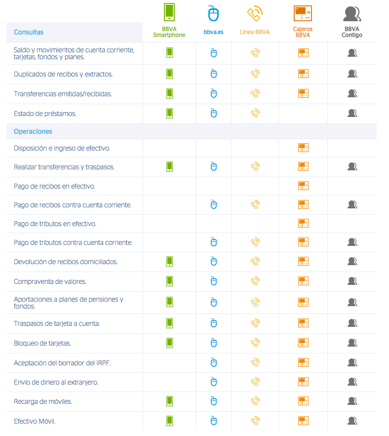 Las operaciones que podremos realizar desde otros medios que proporciona BBVA son los siguientes: